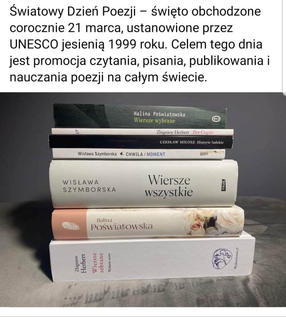 Światowy dzień poezji Zobacz również Konkurs plastyczny "Moja ulubiona postać z bajki" "Cała Polska czyta dzieciom" Zajęcia czytelnicze w bibliotece Dzień PLUSZOWEGO MISIA w bibliotece Biblioteka szkolna zaprasza i poleca Światowy dzień poezji ŚWIATOWY DZIEŃ KSIĄŻKI Realizacja projektu "Mała Książka- Wielki Człowiek"... Realizacja projektu "Mała Książka- Wielki Człowiek"... Konkurs czytelniczy dla klas II - III Konkurs literacki i konkurs czytelniczy Konkurs czytelniczy dla klas IV - VIII