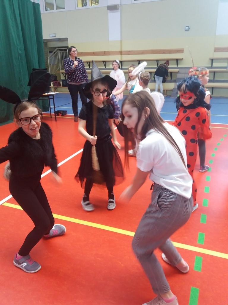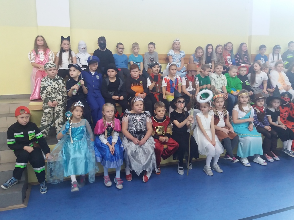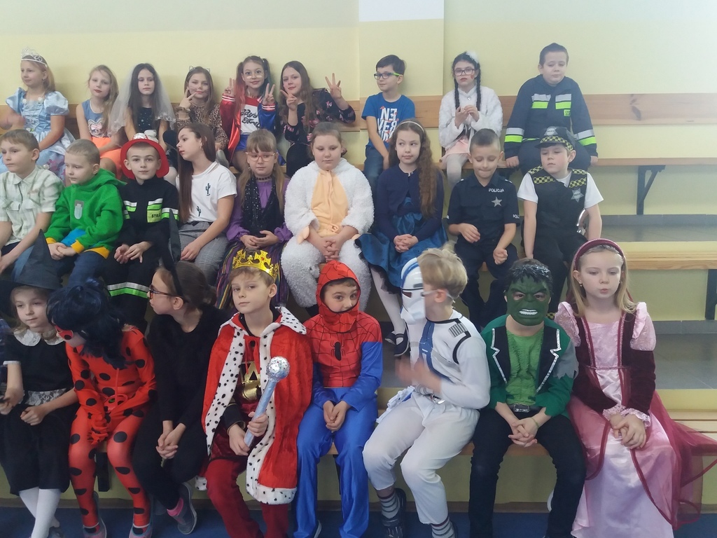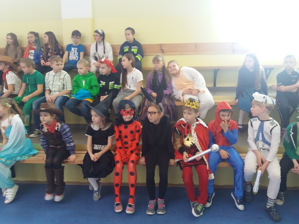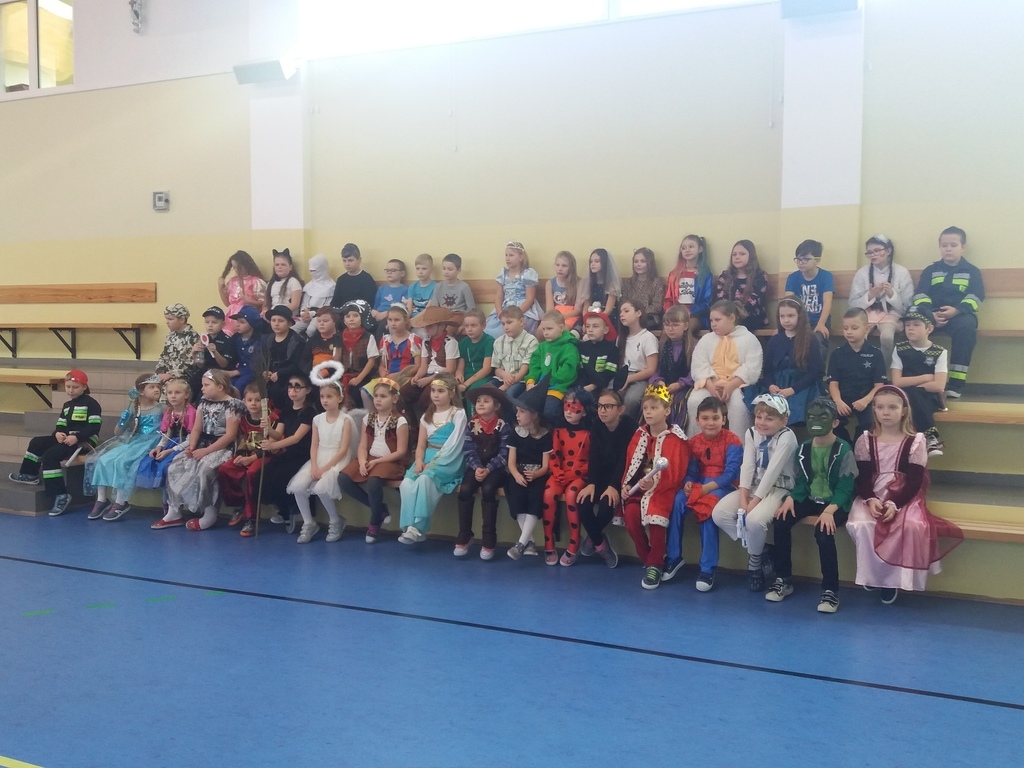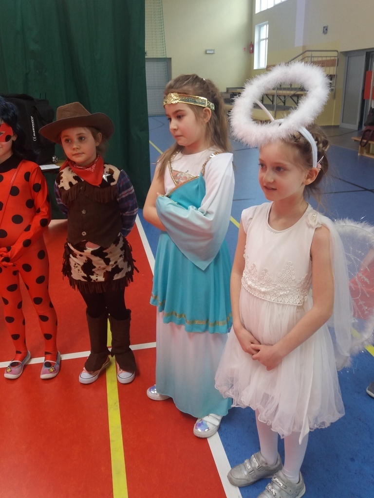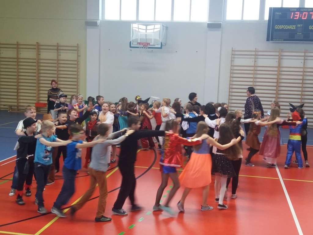 Na sali gimnastycznej naszej szkoły pojawiły się kolorowe postacie. Dzieci przebrane były za bohaterów znanych bajek, można było zobaczyć: wróżki, królewny,biedronki, księżniczki, rycerzy, piratów, policjantów, żołnierzy, Żówie Ninja, Batmany, …nie sposób zliczyć i wymienić tych wszystkich postaci. Na sali podczas pląsów było bardzo kolorowo, wszyscy bawili się wesoło, uśmiech nie znikał z twarzy mimo chwilowego zmęczenia. Kiedy czas zabawy dobiegł końca dzieci z żalem opuszczały salę. Bal umożliwił dzieciom i wychowawcom spędzenie czasu w miłej atmosferze. Wspólna zabawa przyniosła wiele radości naszym wychowankom, a to było głównym celem tego balu.