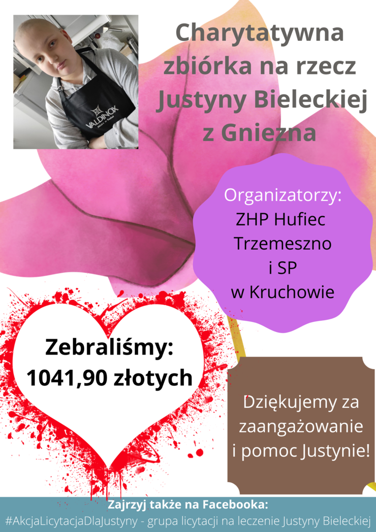 Charytatywna zbiórka na rzecz Justyny Bieleckiej Podczas charytatywnej zbiórki "Zamiast kwiatków..." na rzecz Justyny Bieleckiej z Gniezna jako Szkoła Podstawowa w Kruchowie zebraliśmy 1041,90 zł Bardzo wszystkim dziękujemy !!! Zdjęcia Zobacz również Gminny Przegląd Piosenki Angielskiej dla Przedszkolaków... Informacja Matematyka-zbiór zadań do zakupienia przez ucznia... Charytatywna zbiórka na rzecz Justyny Bieleckiej Zakończenie klasy VIII Zakończenie Roku Szkolnego 2020 / 2021 25 czerwca 2021 Aktualności Wydrukuj Udostępnij Wyświetlono: 213
