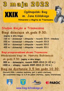 OSiR w Trzemesznie zapraszama do udziału uczniów szkół podstawowychw Biegach Dziecięcych i Młodzieżowych im. Henryka Bisikiewicza,zaplanowanych na dzień 3 maja.Biegi odbędą się na Stadionie Miejskim w Trzemesznie.Dla wszystkich uczestników przewidziane są medale oraz słodki poczęstunek,najlepsi zawodnicy w swoich kategoriach otrzymają statuetki oraz nagrody rzeczowe.