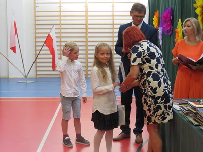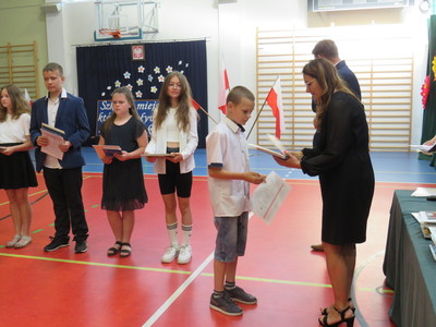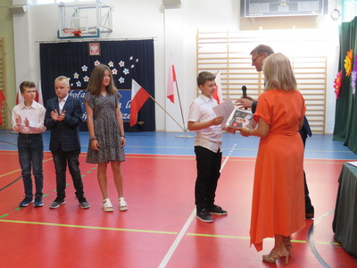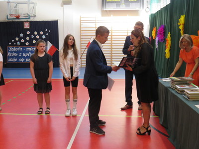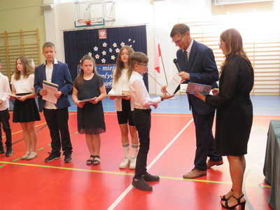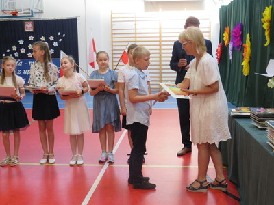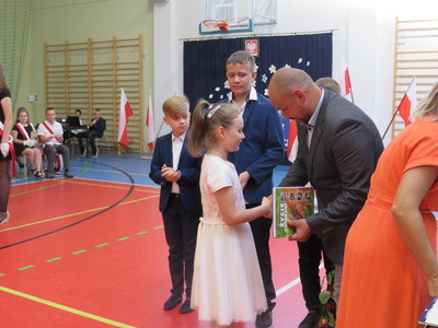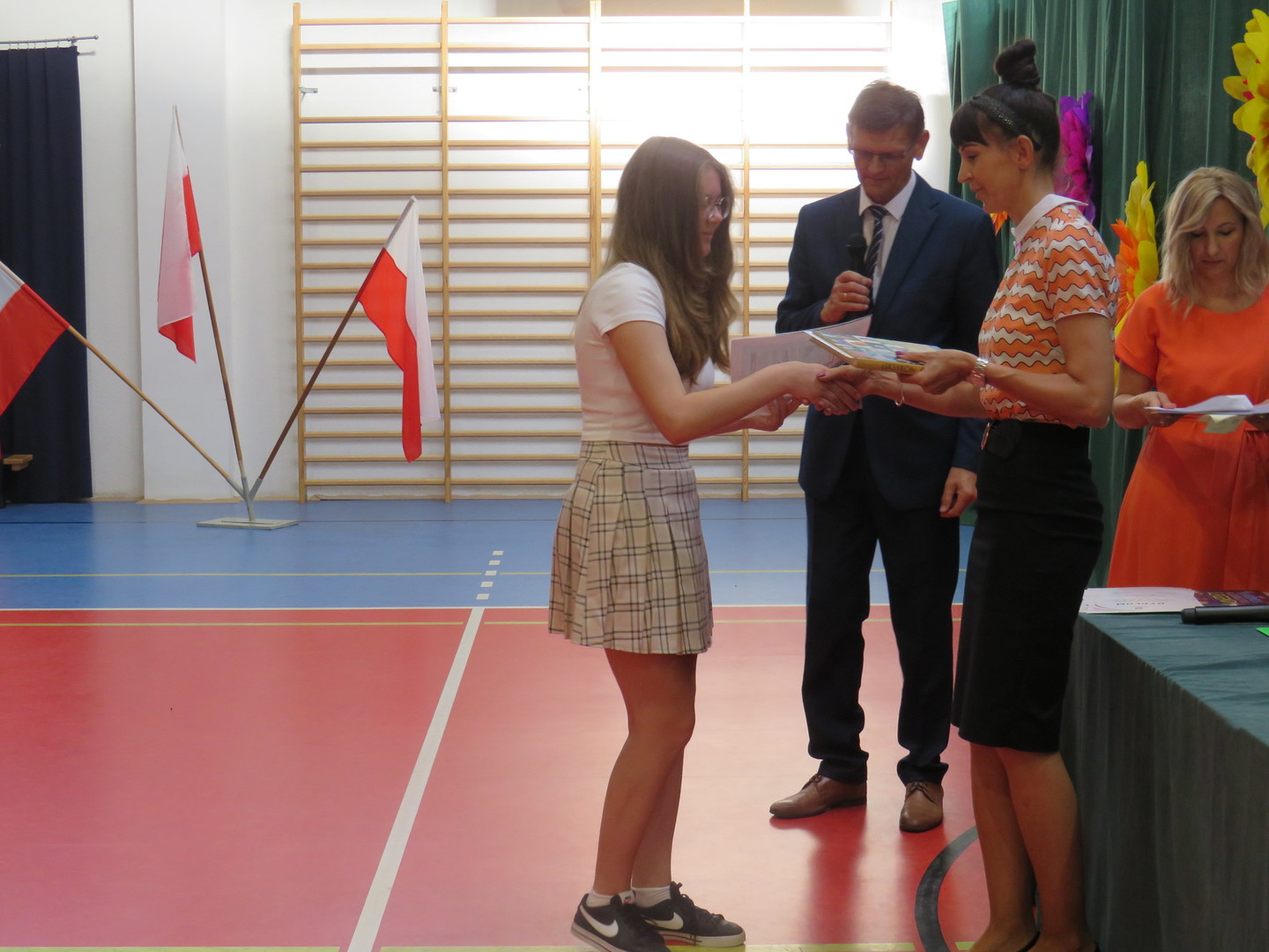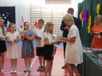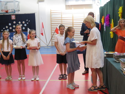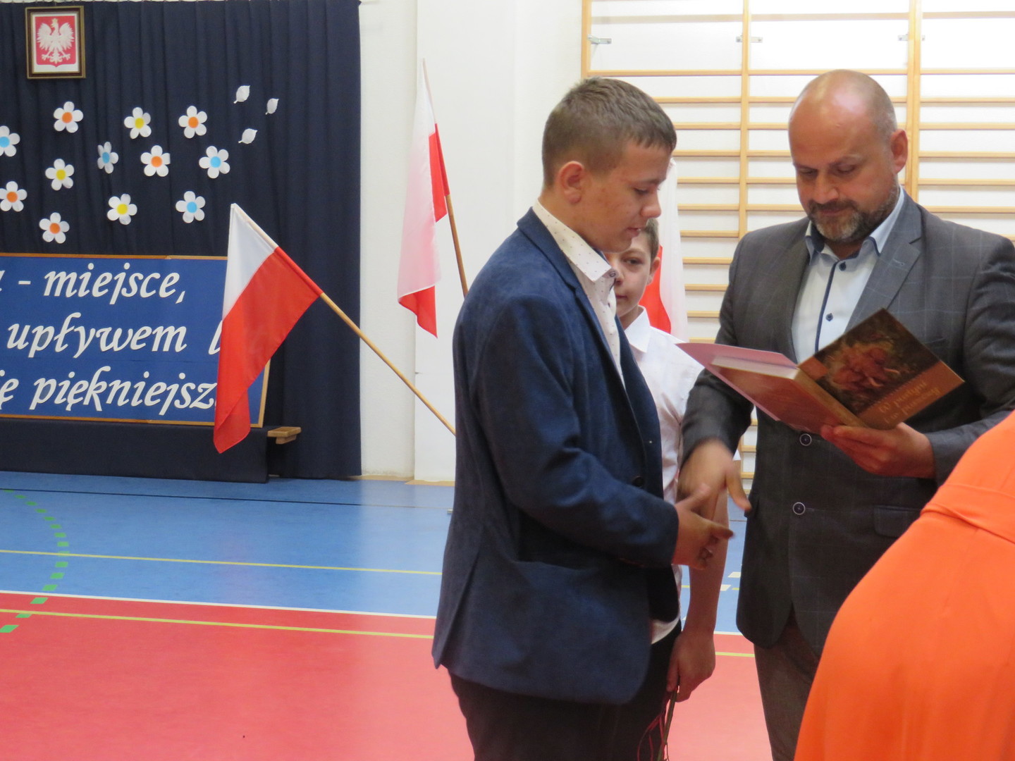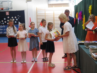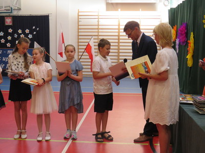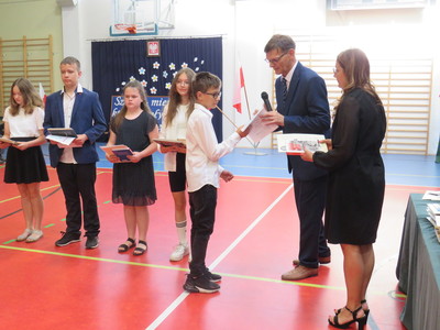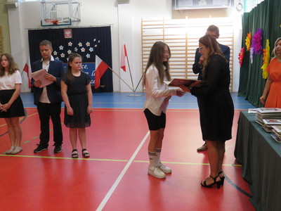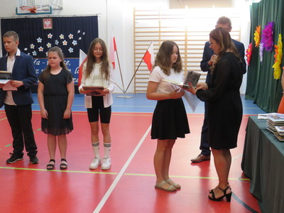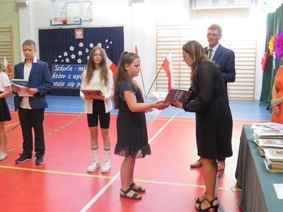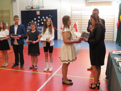 Duża grupa otrzymała świadectwa z biało- czerwonym pasem oraz nagrody książkowe.