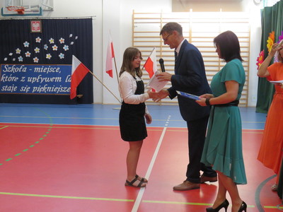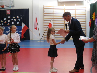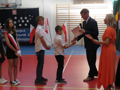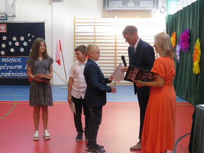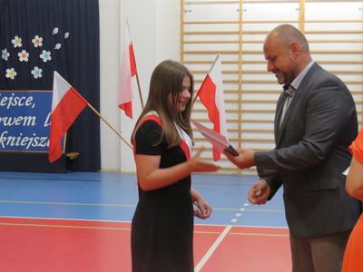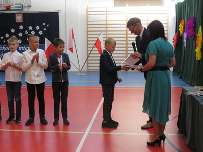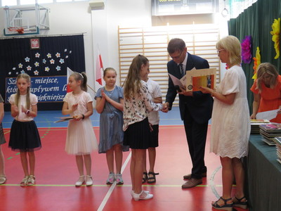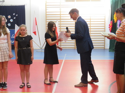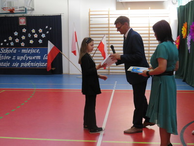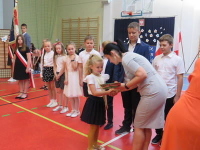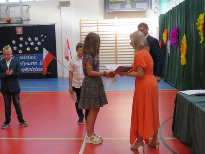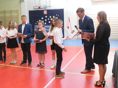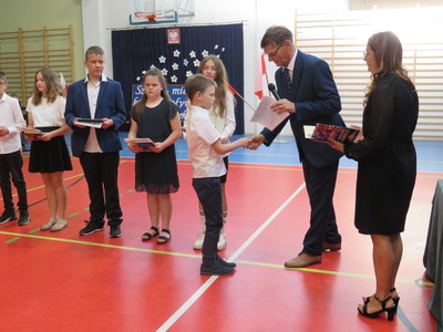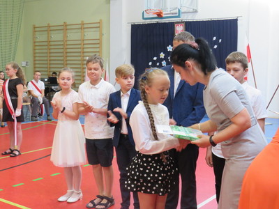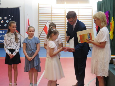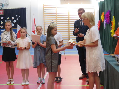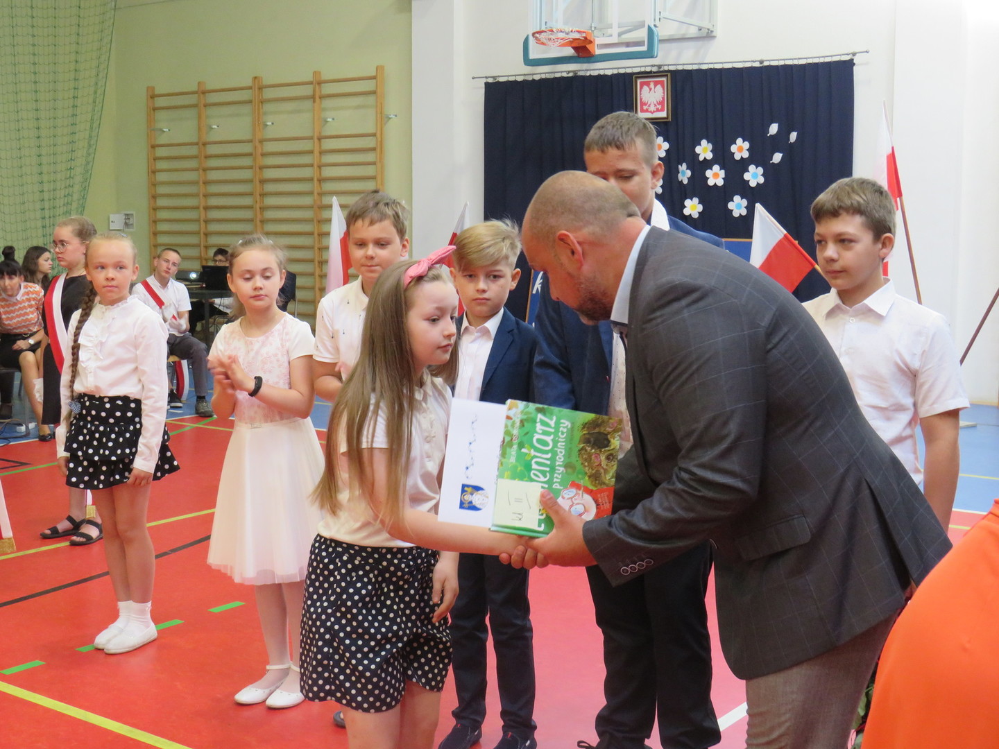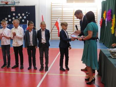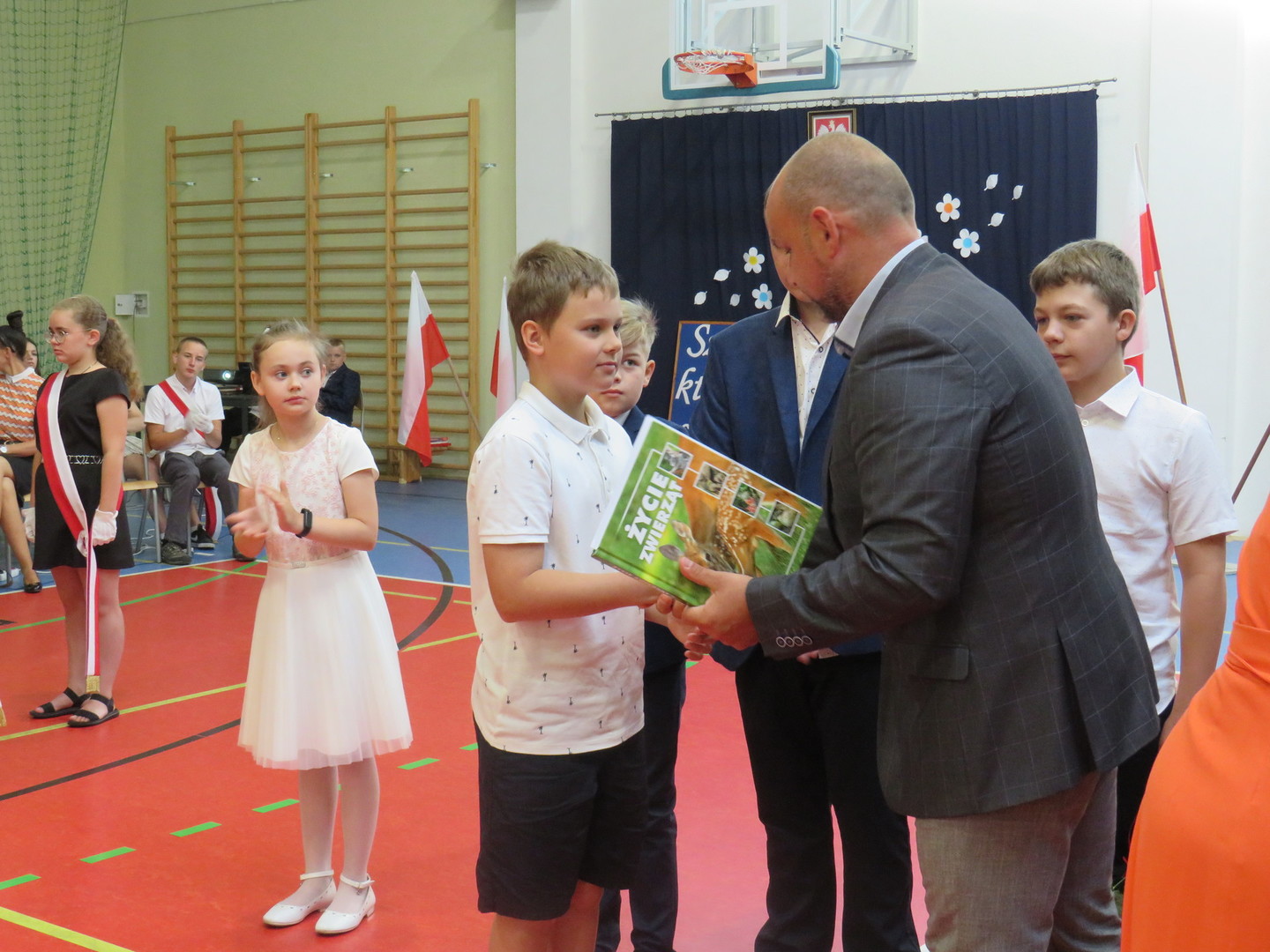 Duża grupa otrzymała świadectwa z biało- czerwonym pasem oraz nagrody książkowe.