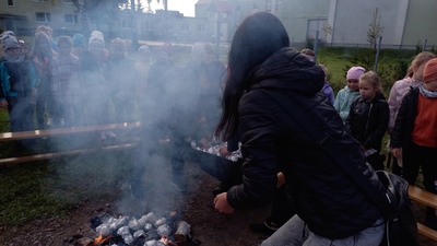 W oczekiwaniu na pyszne pieczone ziemniaki, nasi uczniowie z twarzami pełnymi uśmiechów
