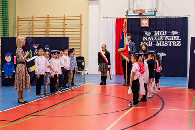 Po złożeniu ślubowania dyrektor szkoły dokonał aktu pasowania na ucznia, a wychowawczyni wręczała