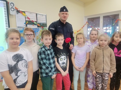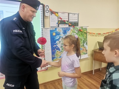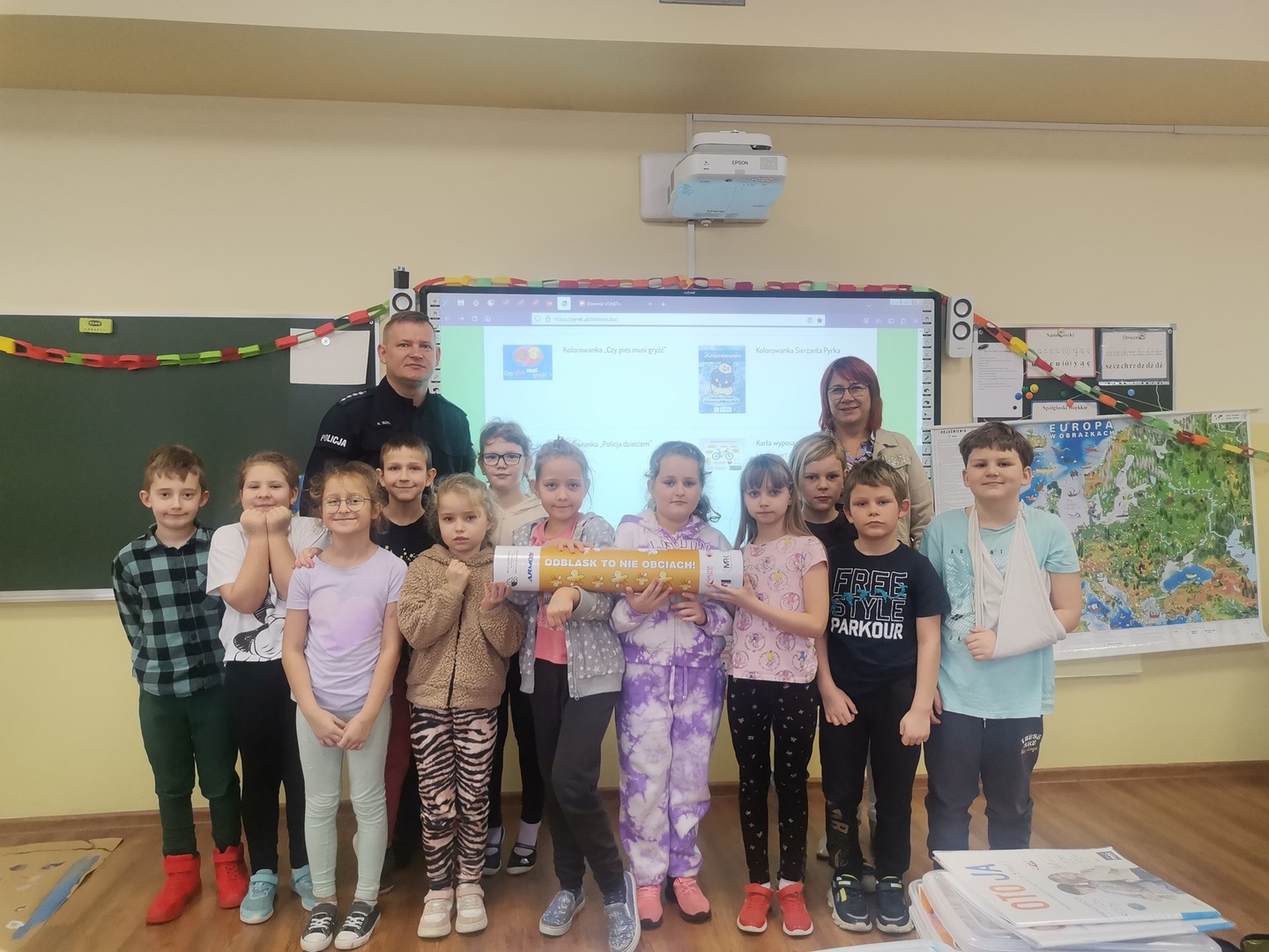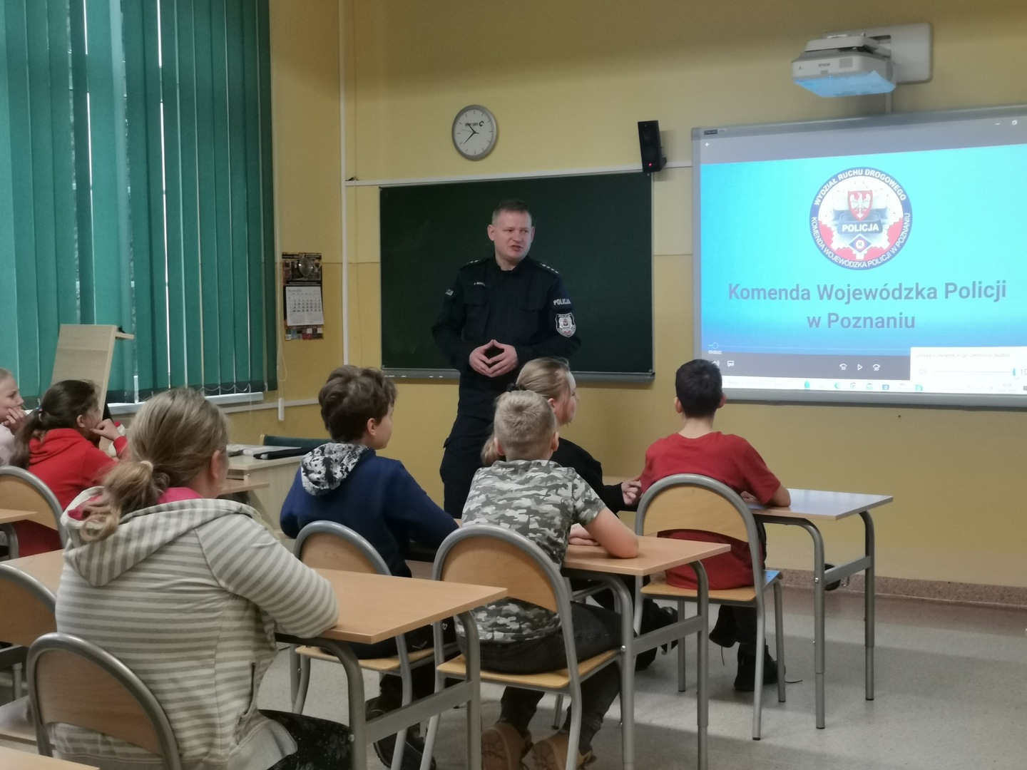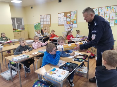 Policjant rozmawiał z uczniami o podstawowych zasadach bezpieczeństwa w ruchu drogowym, podkreślił