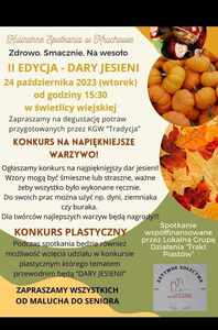 II edycja DARY JESIENI Sołectwo Kruchowo oraz KGW "Tradycja" zaprasza na degustację potraw oraz na konkurs plastyczny w dniu 24 października 2023 r. (wtorek) od godz. 15.30 Zdjęcia Zobacz również Dzień Edukacji Narodowej Ślubowanie klasy I Konkurs historyczno- plastyczny II edycja DARY JESIENI Spotkanie z zawodniczkami MKS PR Gniezno Podsumowanie zawodów w unihokeja 20 października 2023 Aktualności Wydrukuj Udostępnij Wyświetlono: 101