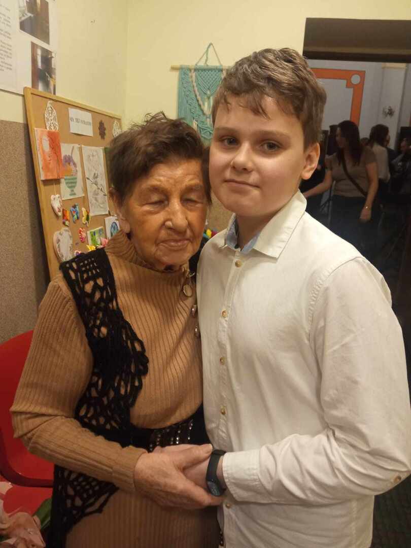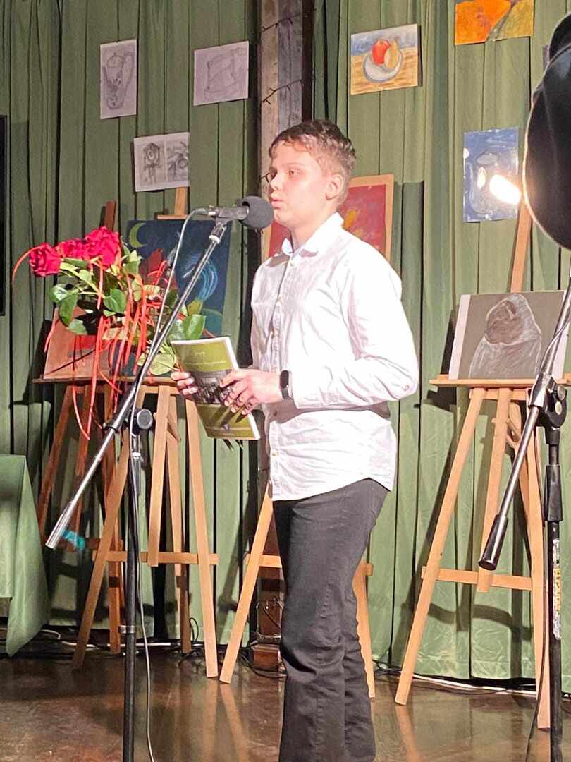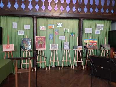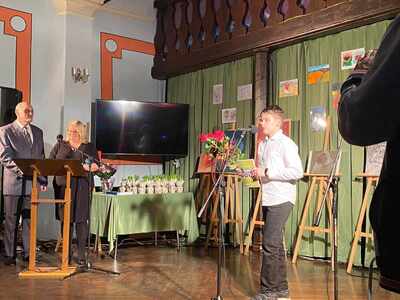 Staś nie tylko pięknie recytuje, ale goście mogli obejrzeć również jego prace plastyczne, które stanowiły wystrój sali.