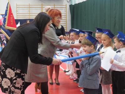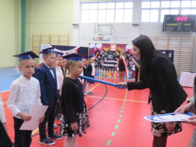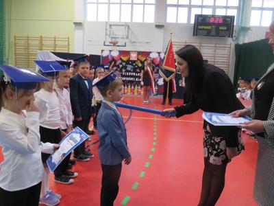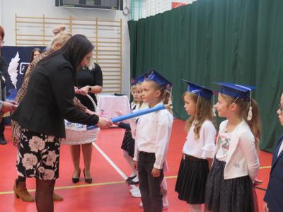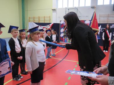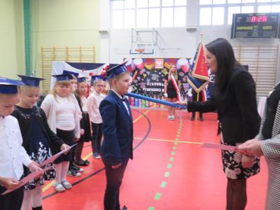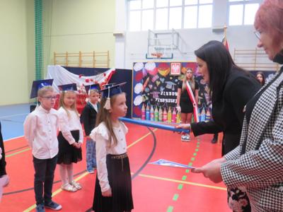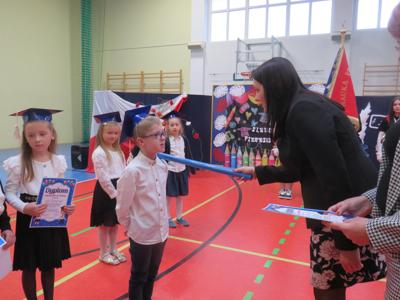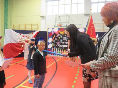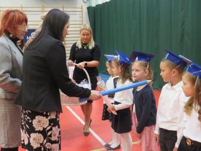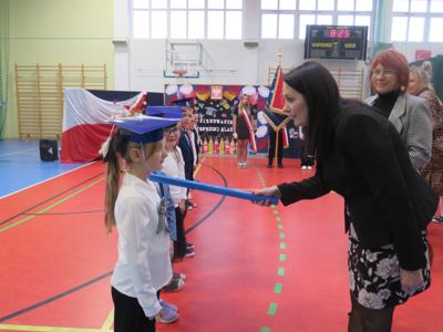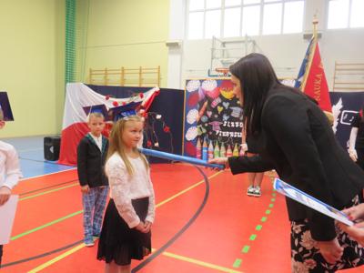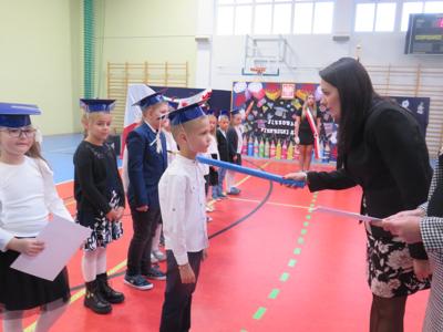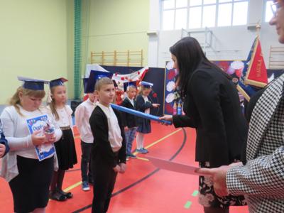 Po złożeniu ślubowania Pani Dyrektor Joanna Kańczukowska dokonała symbolicznego pasowania na ucznia dotykając ołówkiem,